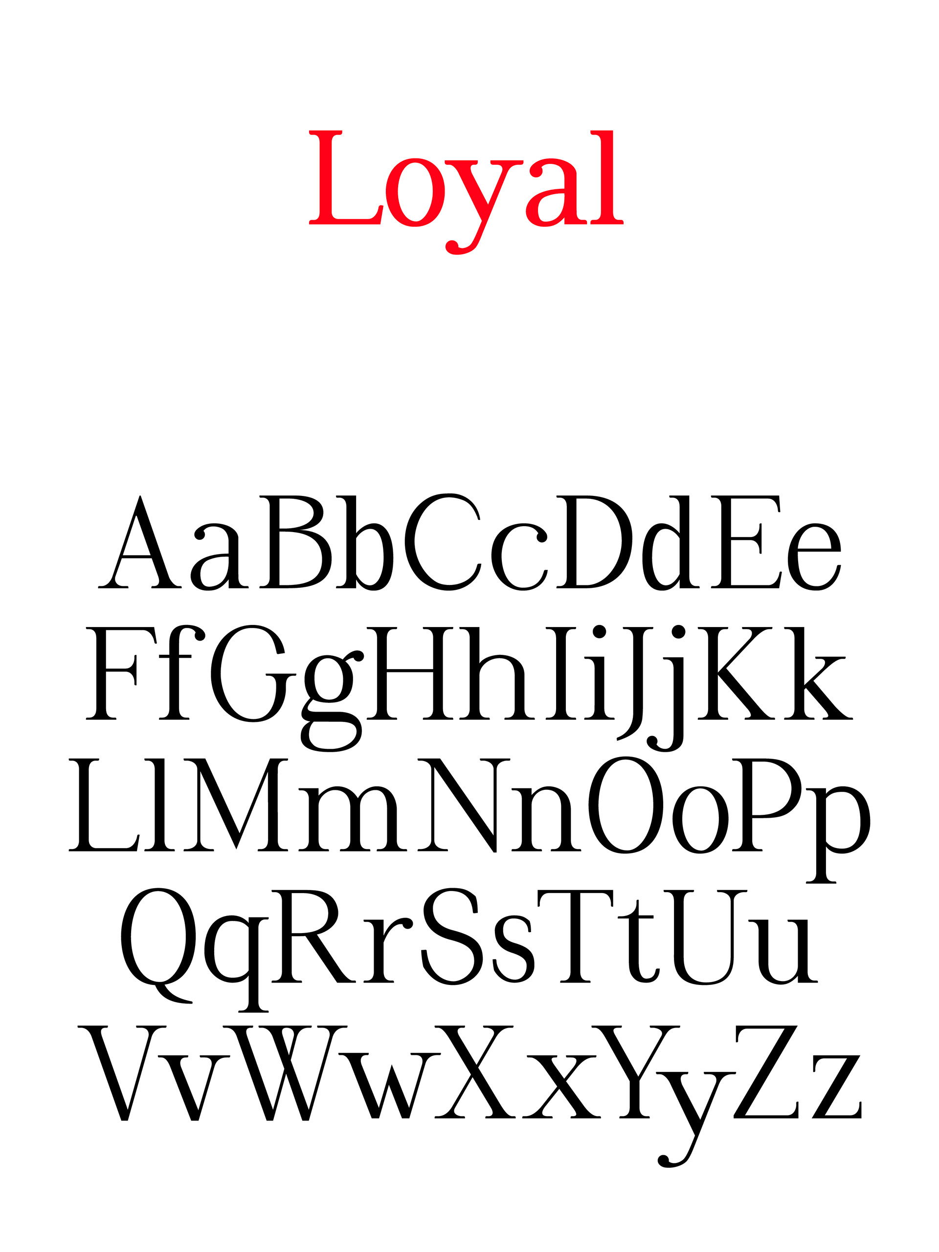 Across a multitude of testing and revising stages, with ample opportunities to play with form and recognize the artistic value of letterforms, this concept became a full-fledged font family, free-and-open-source for others to test and experiment on. To construct "Loyal" I routinely checked and researched my reference fonts to determine what was standard in Transitional, Humanist, and modern type design and what would otherwise best suit the needs of my typeface. The question I thought about most of all was, "what problem am I trying to solve?" Even though I am still not certain of the answer, this project was an excellent learning experience and a humbling foray into the world of type design.